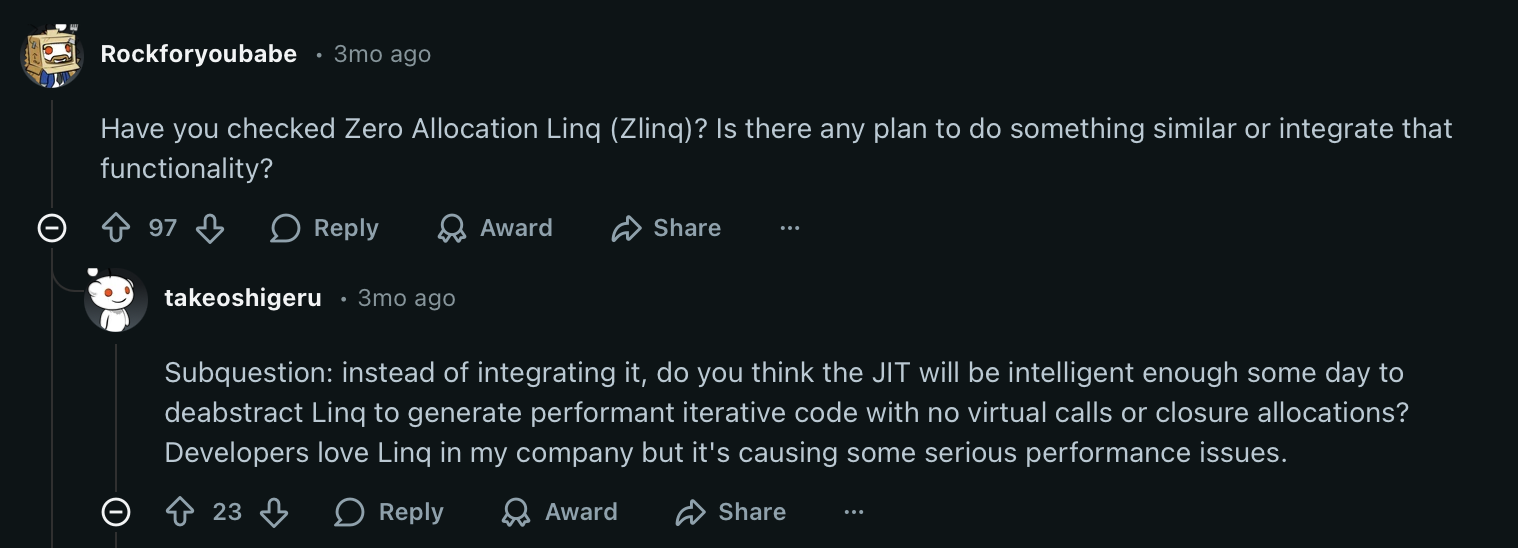 So while foreach over arrays and lists can be allocation-free, once you start composing LINQ operators, you’re back to iterator objects and delegate calls.
